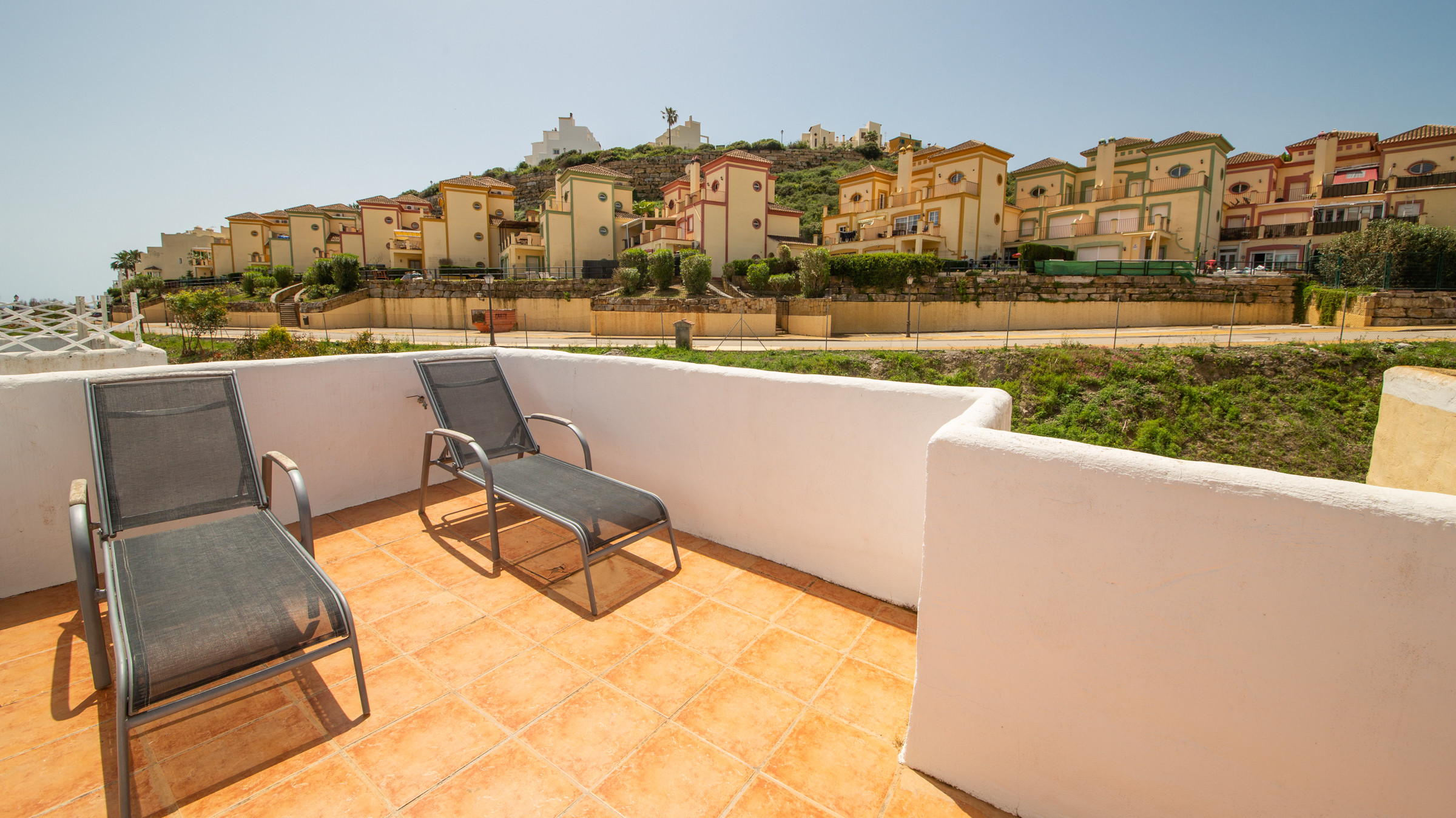 Casa adosada de tres dormitorios y dos cuartos de baño con jardín privado y azotea situada en la urbanización de Cortijos de la Bahía en Casares Costa. Plaza de aparcamiento dentro de la comunidad y piscina comunitaria.