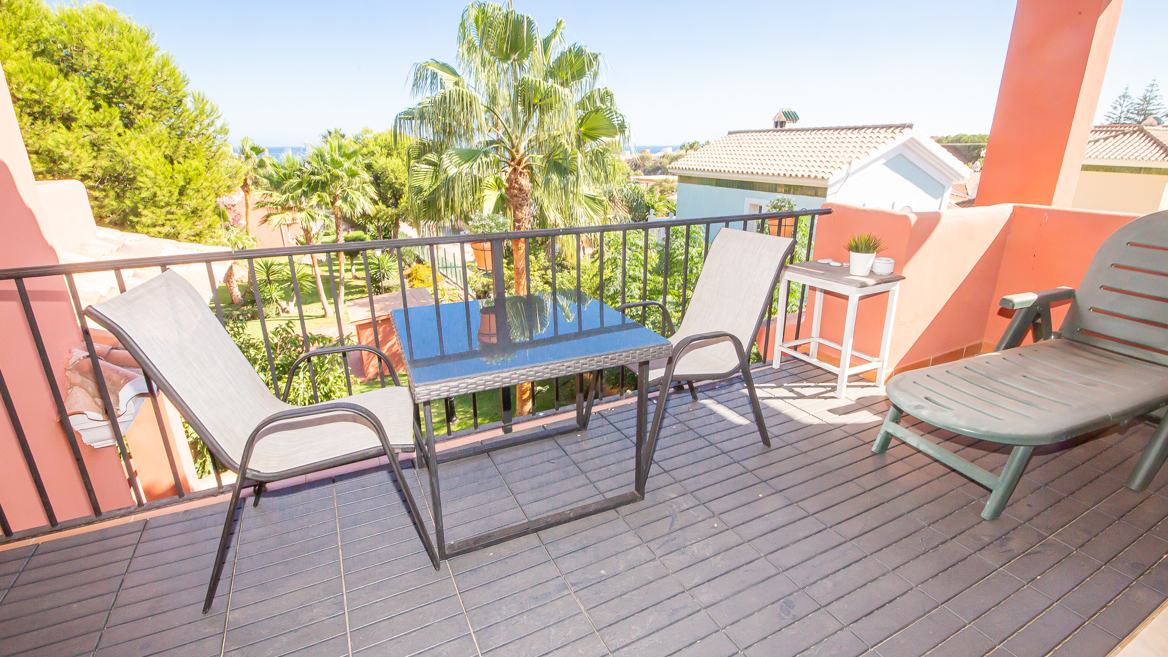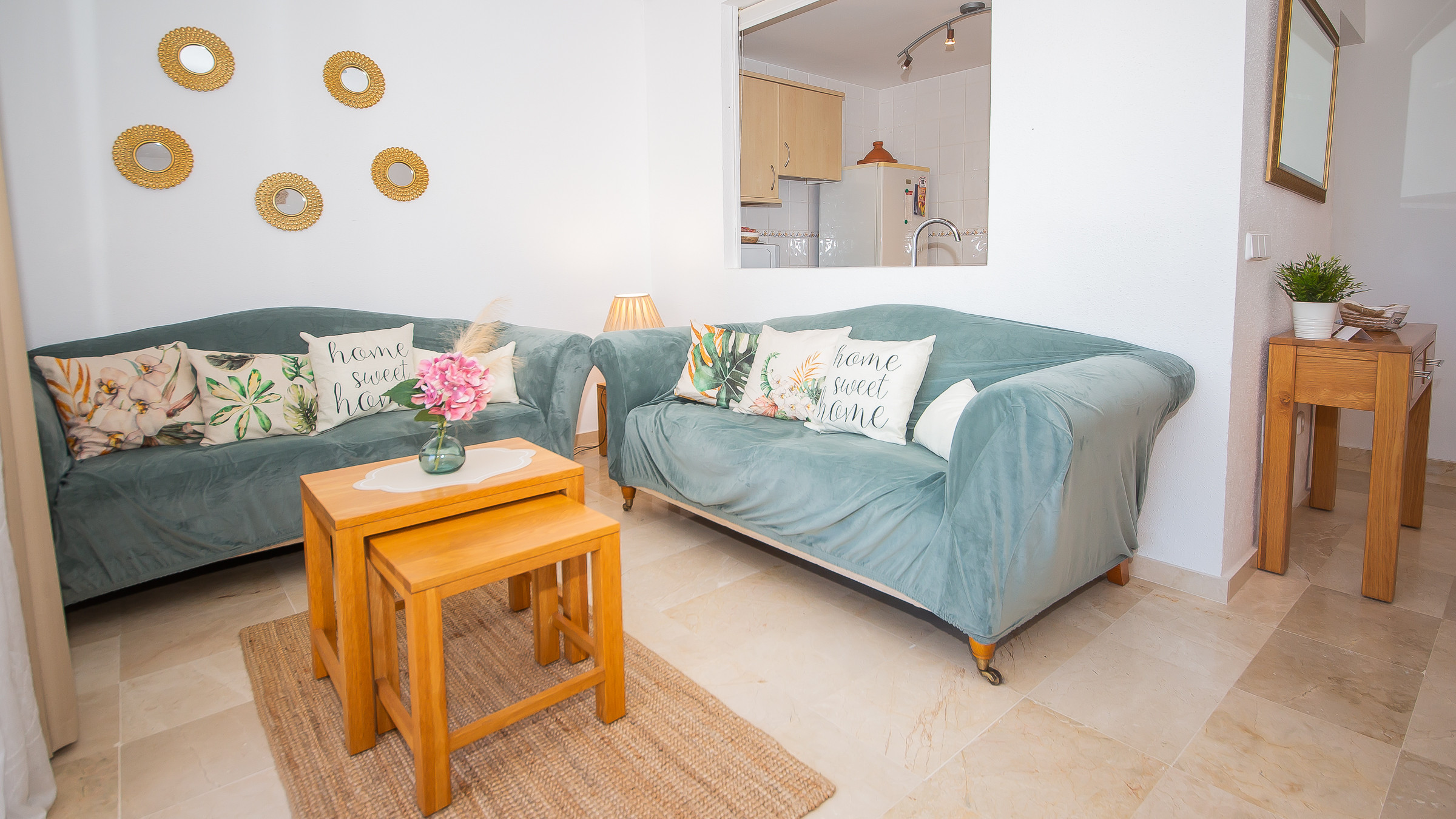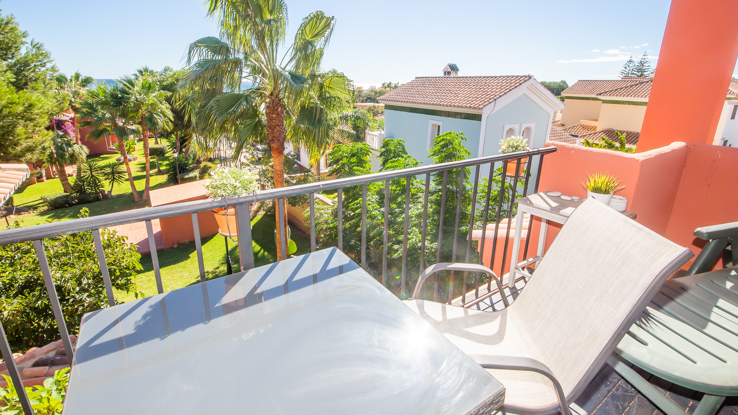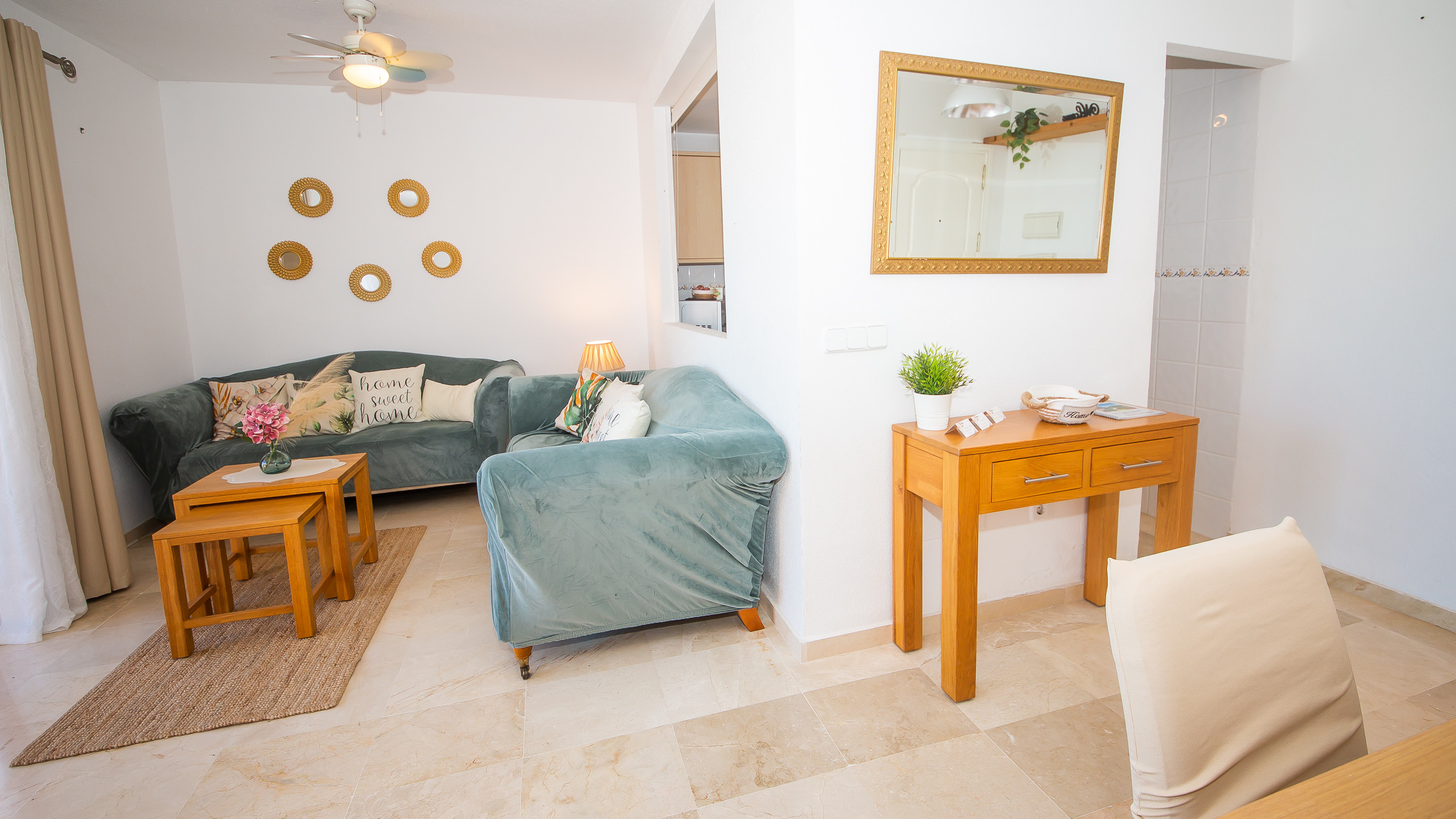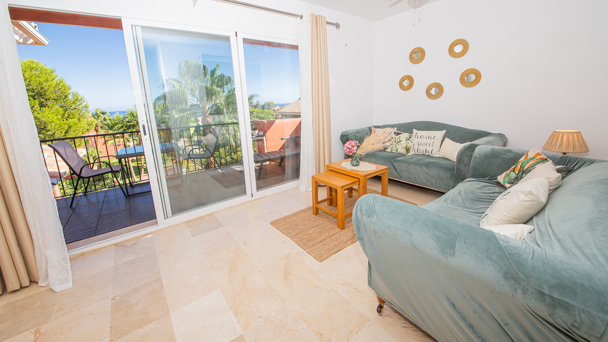 Bonito apartamento de un dormitorio y un baño en Manilva Gardens. Amplio salón con puertas que dan a la terraza, amueblada con mesa, dos sillas y una tumbona.