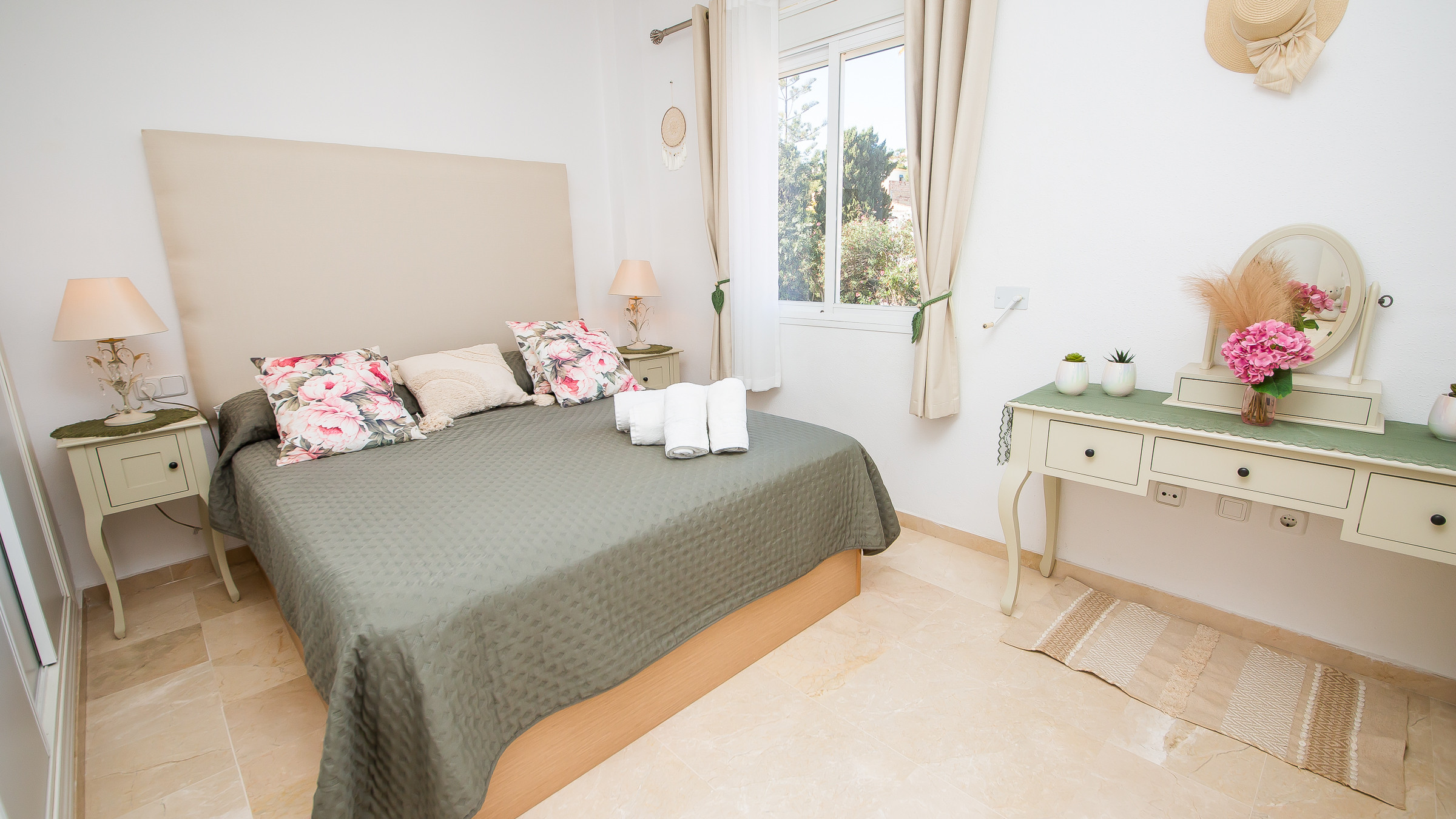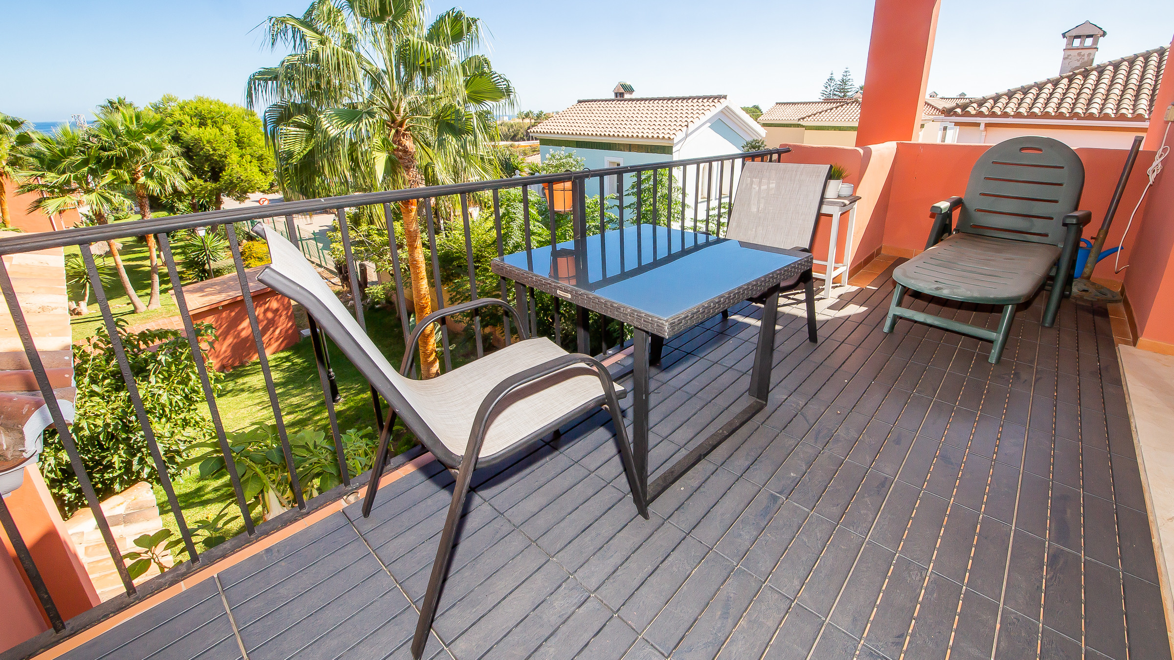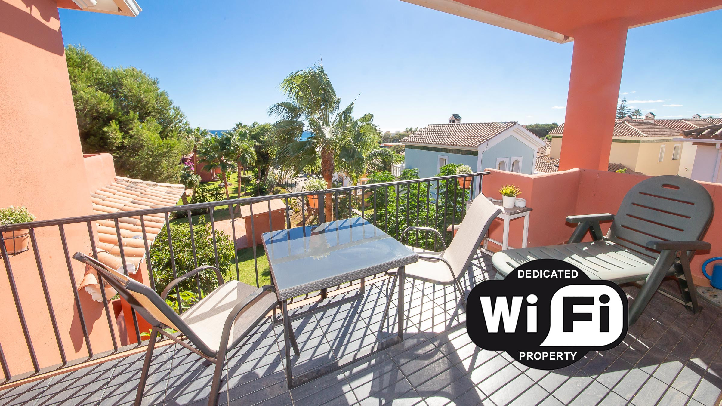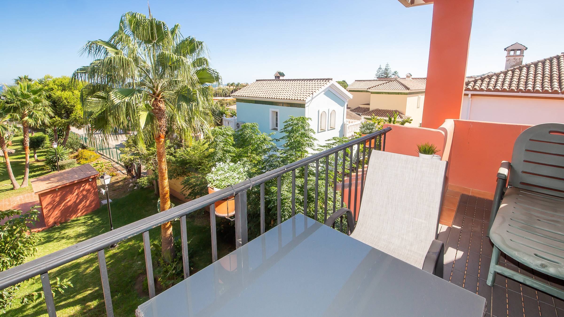 Bonito apartamento de un dormitorio y un baño en Manilva Gardens. Amplio salón con puertas que dan a la terraza, amueblada con mesa, dos sillas y una tumbona.
