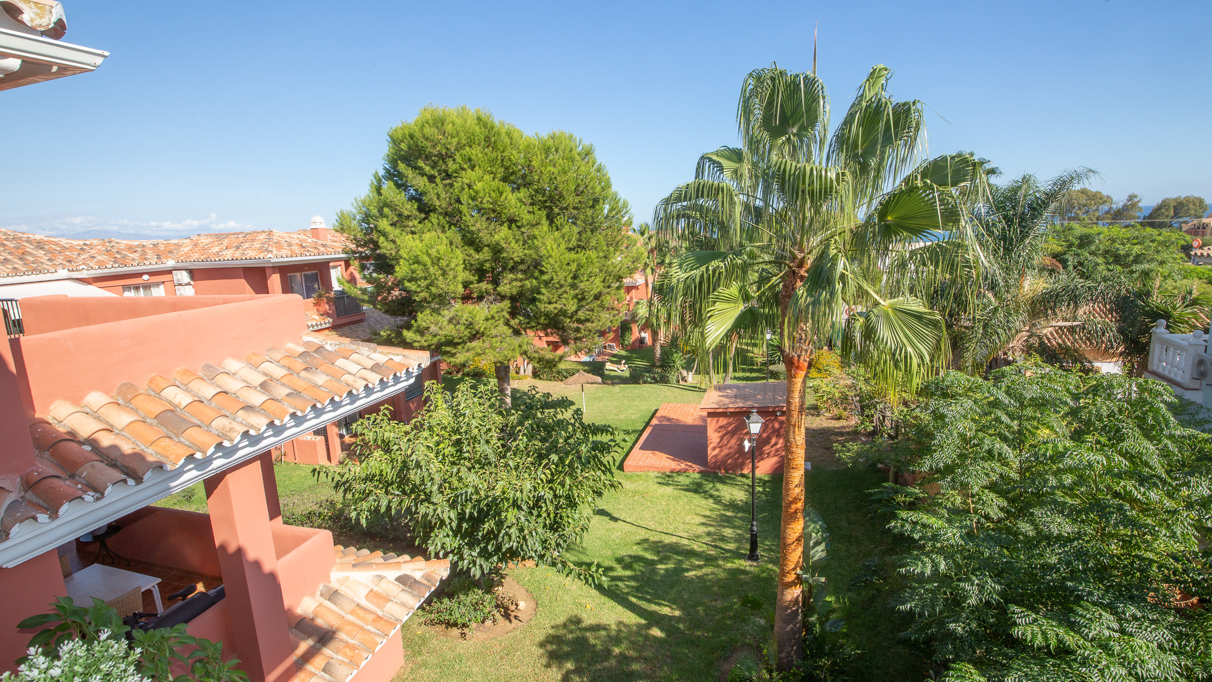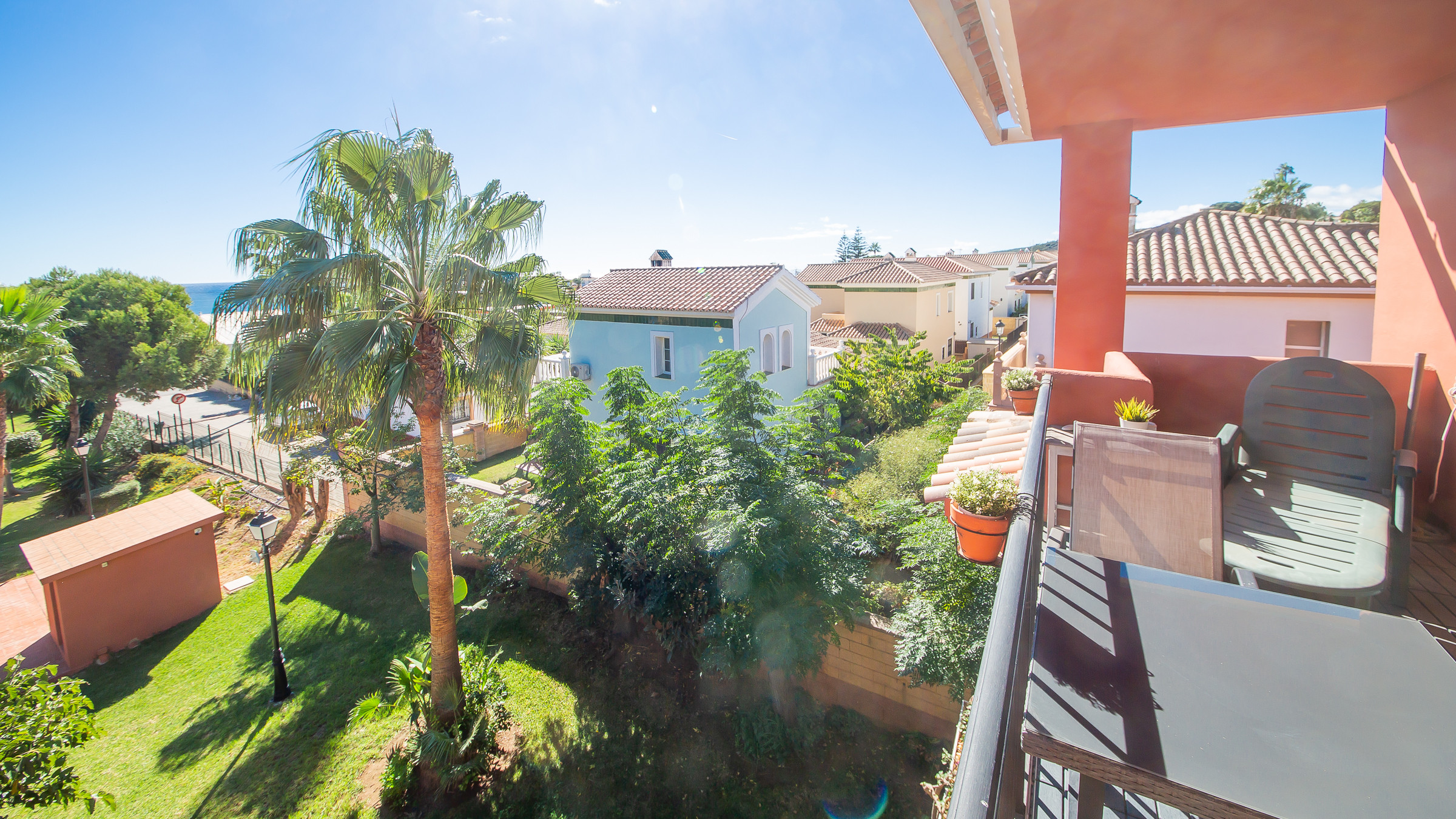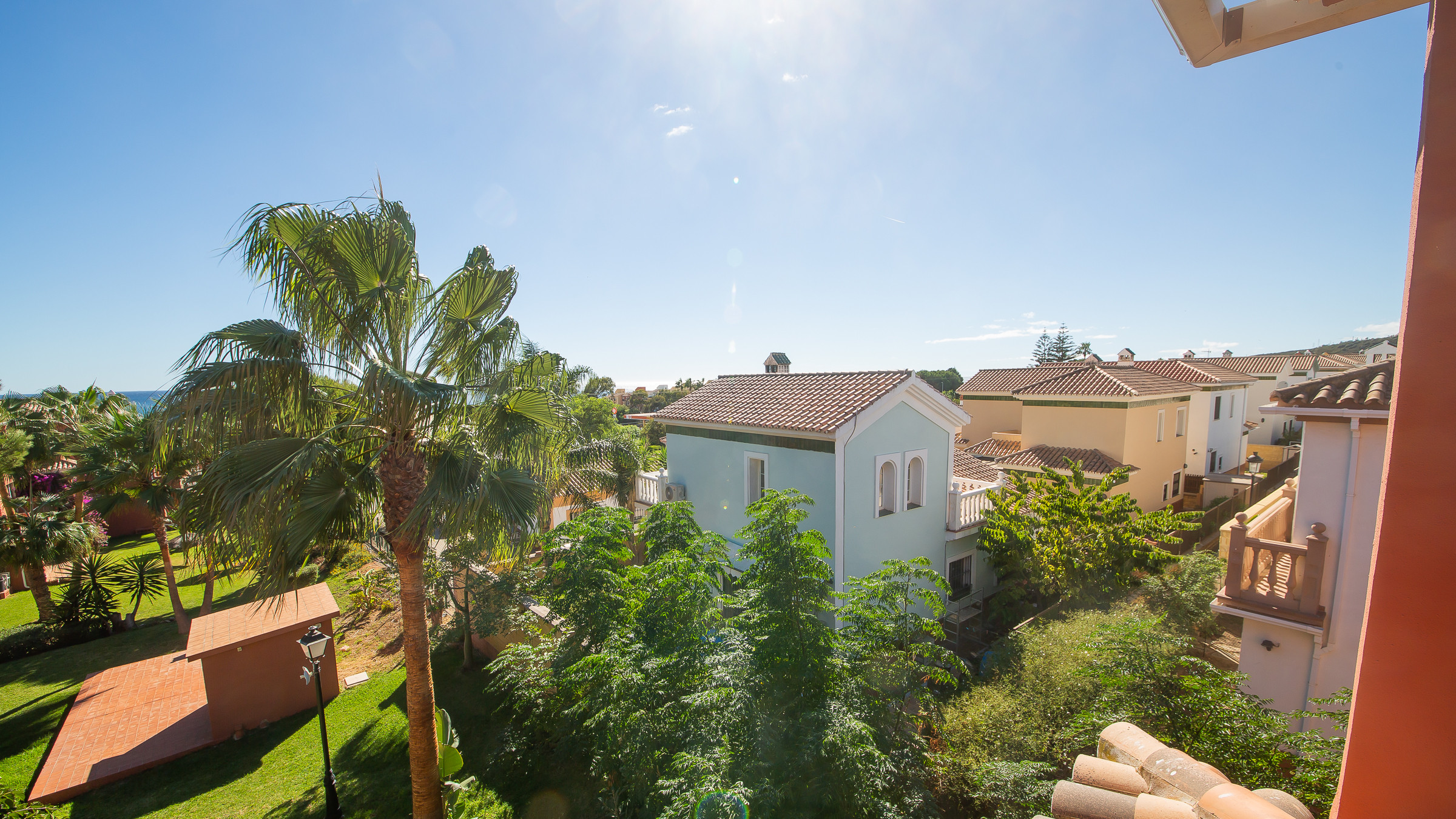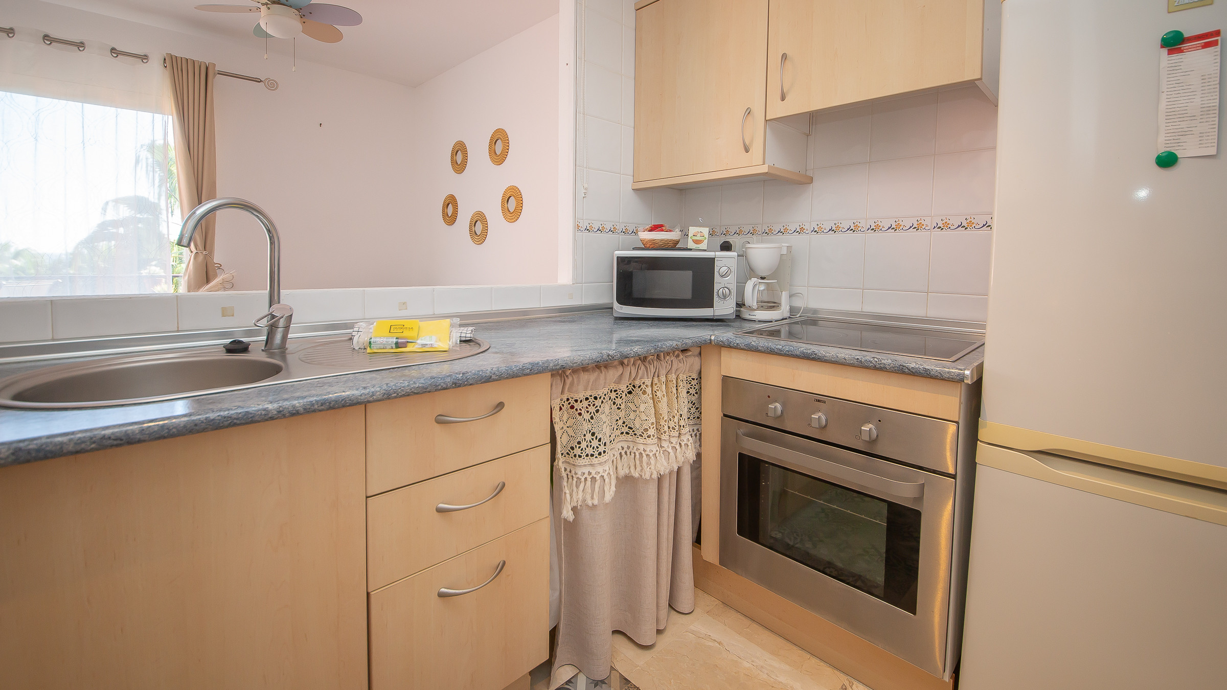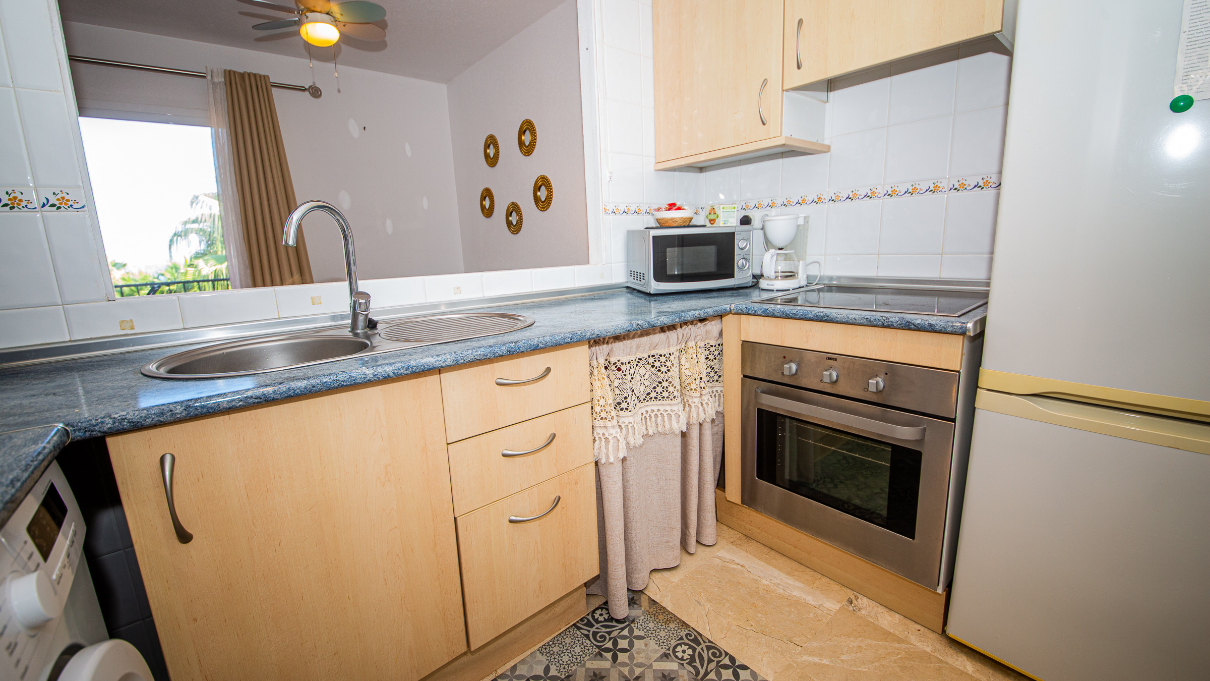 Bonito apartamento de un dormitorio y un baño en Manilva Gardens. Amplio salón con puertas que dan a la terraza, amueblada con mesa, dos sillas y una tumbona.
