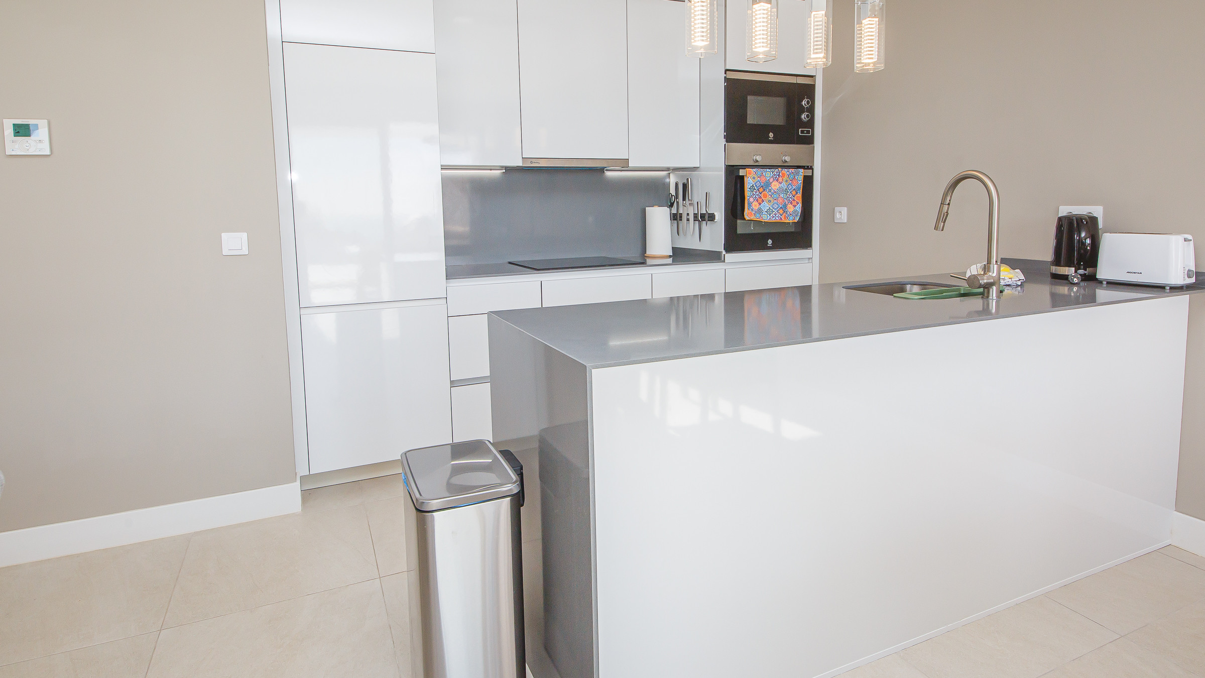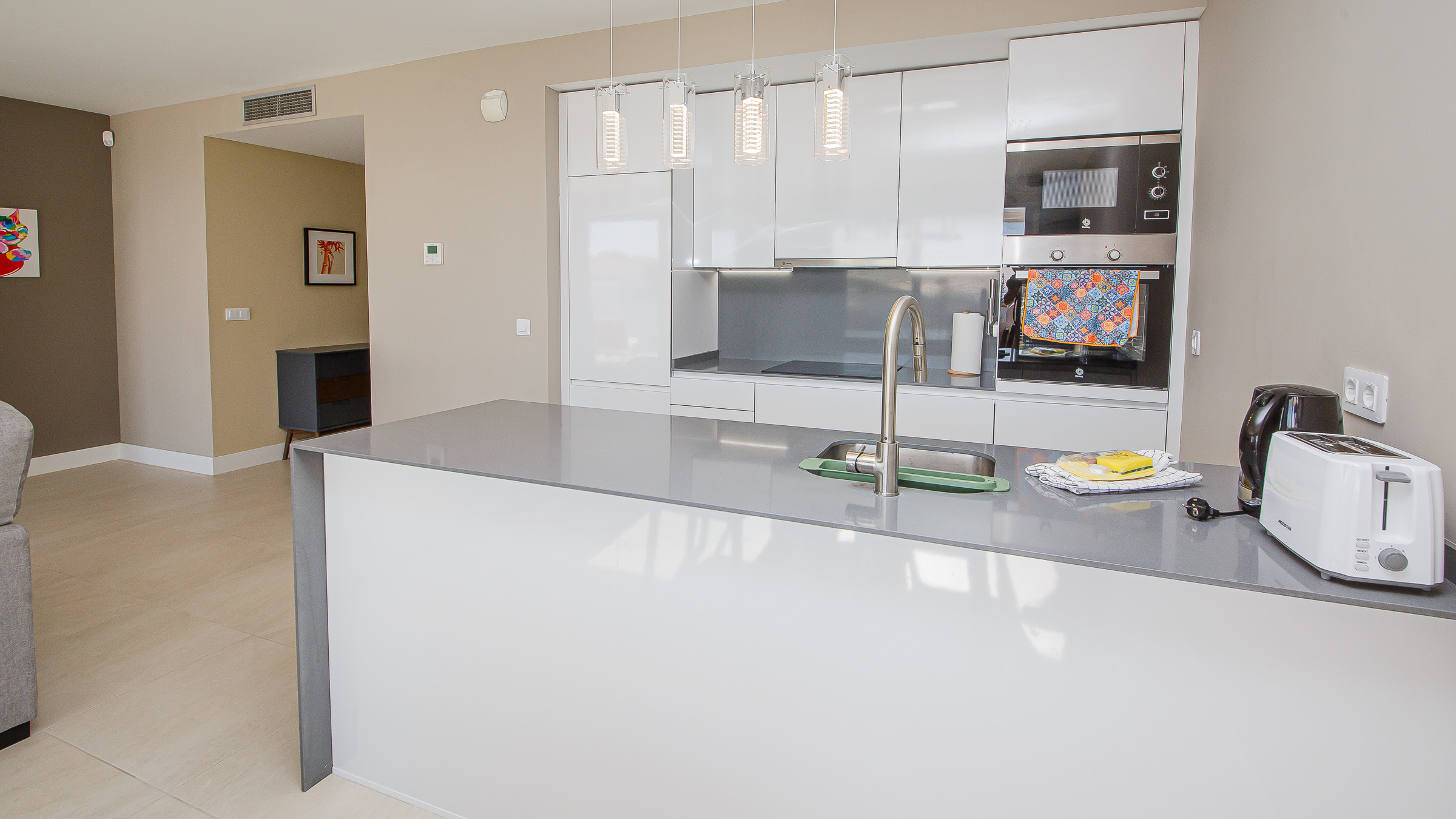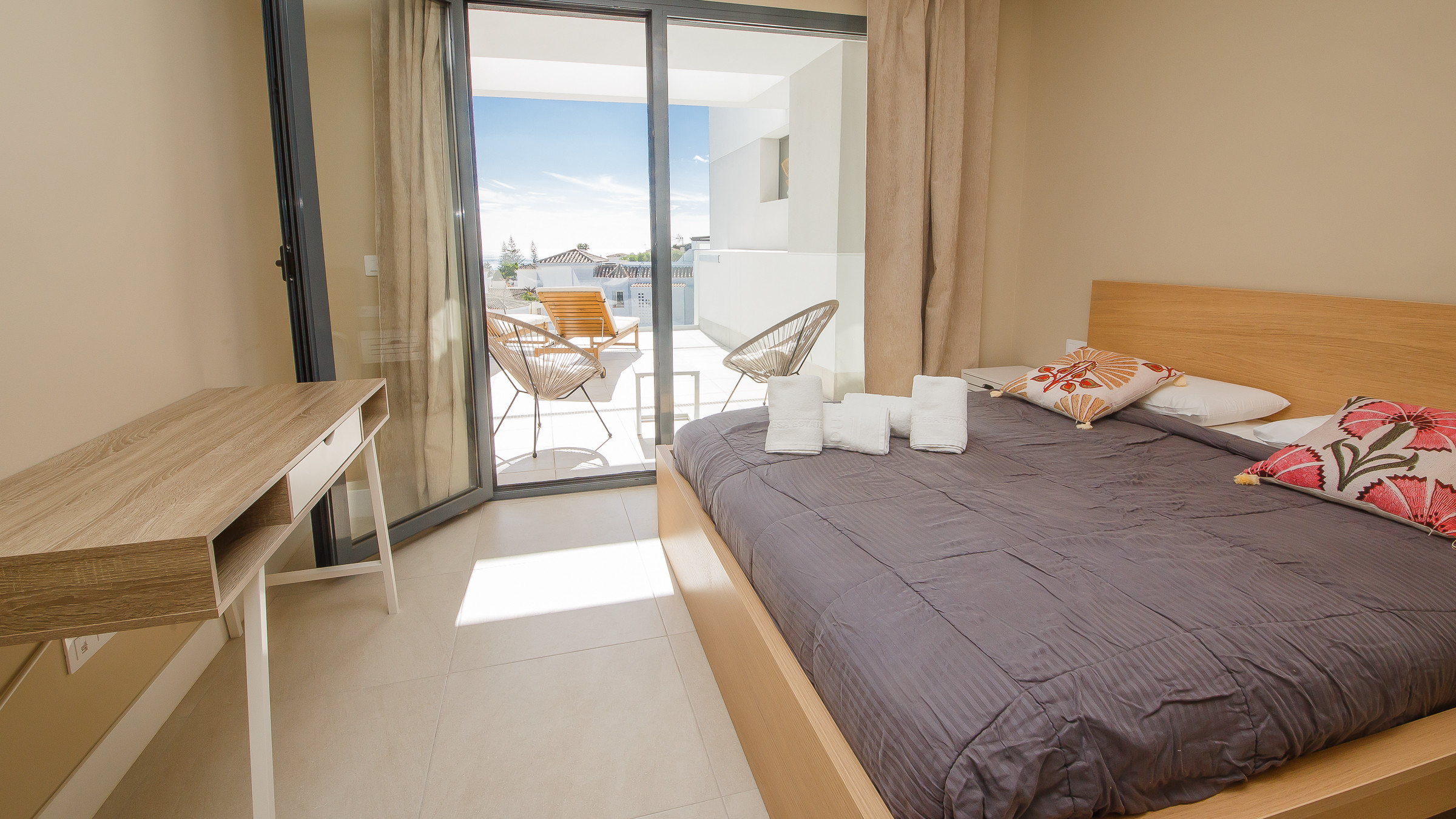 Precioso ático de tres dormitorios en Pure South, ubicado en Princesa Kristina. Amplio y cómodo salón con amplios asientos, cocina americana abierta, perfecta para recibir visitas durante las vacaciones y acceso a la terraza principal a través de puertas que dan al patio. El apartamento también cuenta con wifi, aire acondicionado, dos baños y un aseo. El tercer dormitorio cuenta con un sofá cama individual. El apartamento también dispone de plaza de aparcamiento subterráneo y una gran terraza para disfrutar de las vistas y el sol.