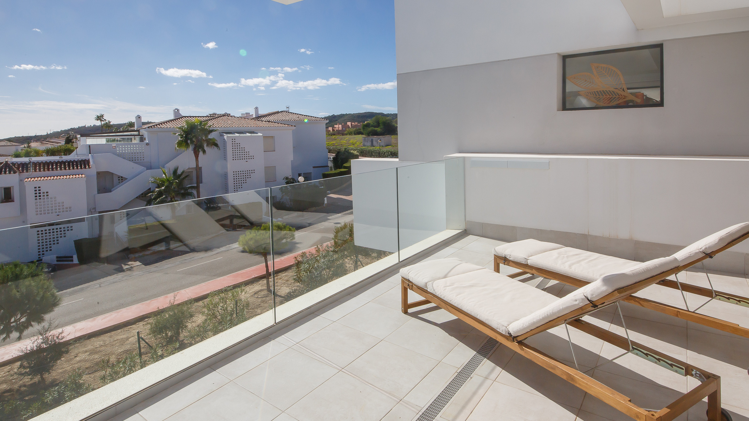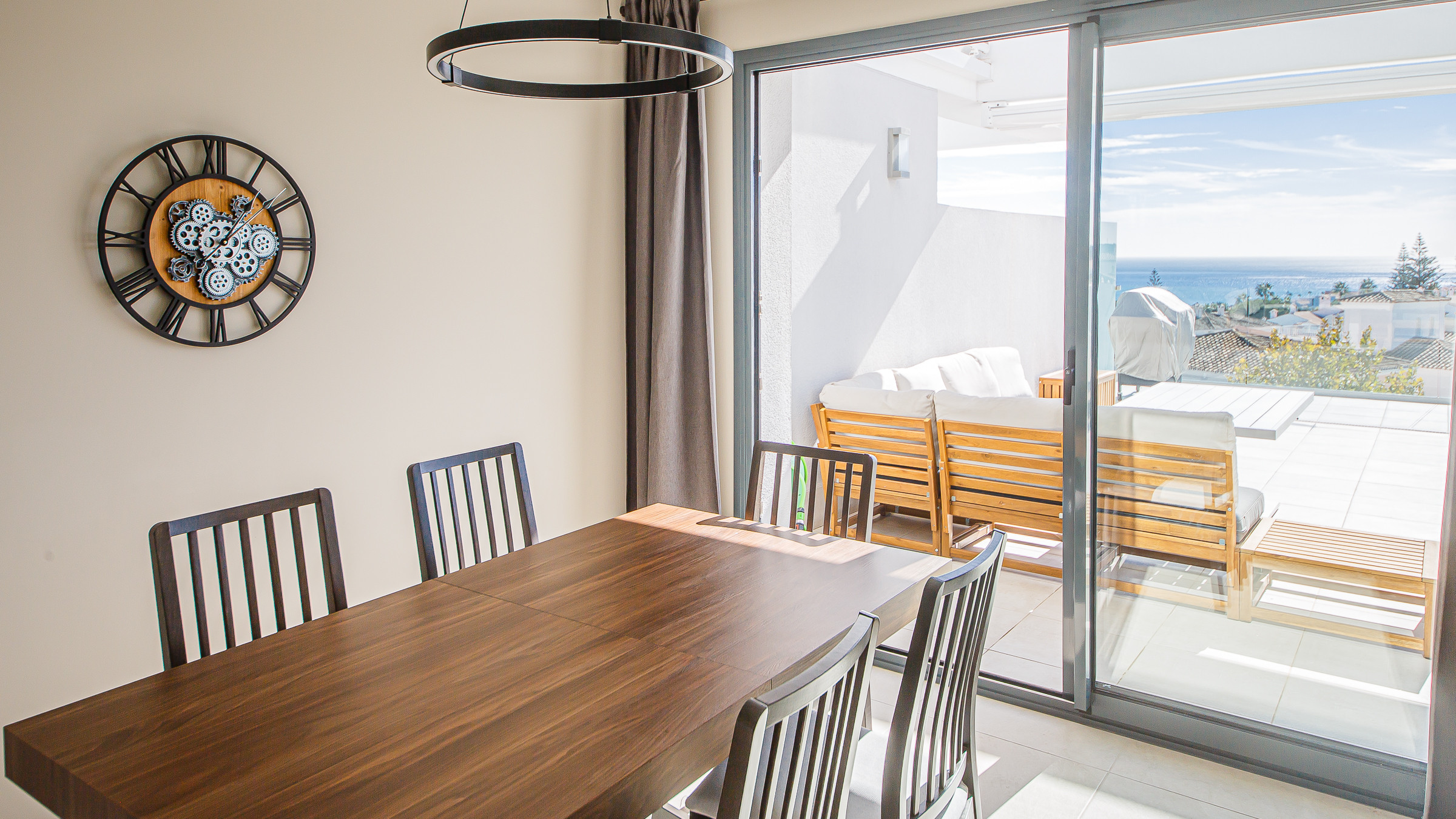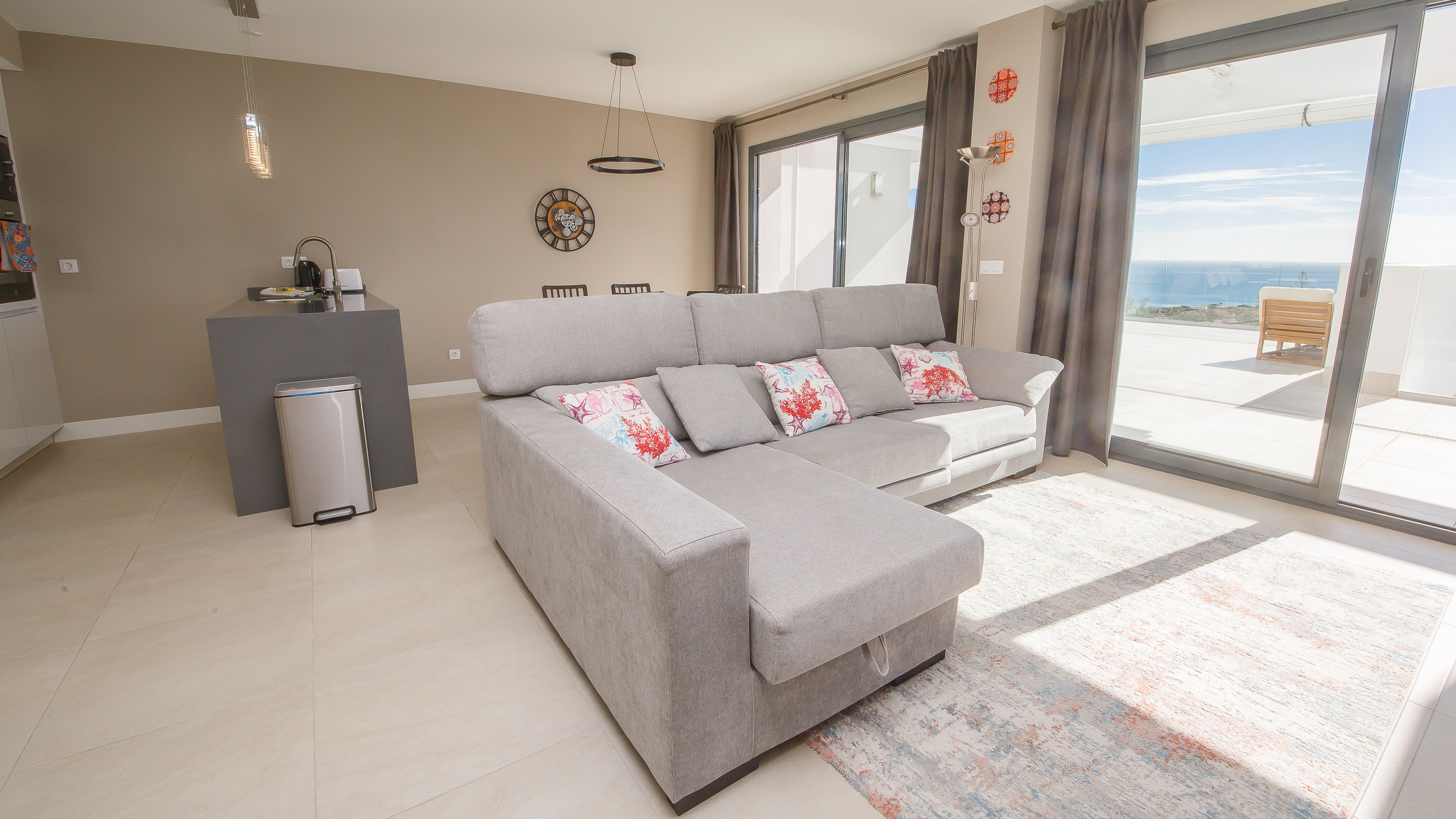 La amplia terraza, orientada al suroeste, ofrece vistas al mar y está amueblada con un conjunto de sofás de exterior y dos tumbonas.