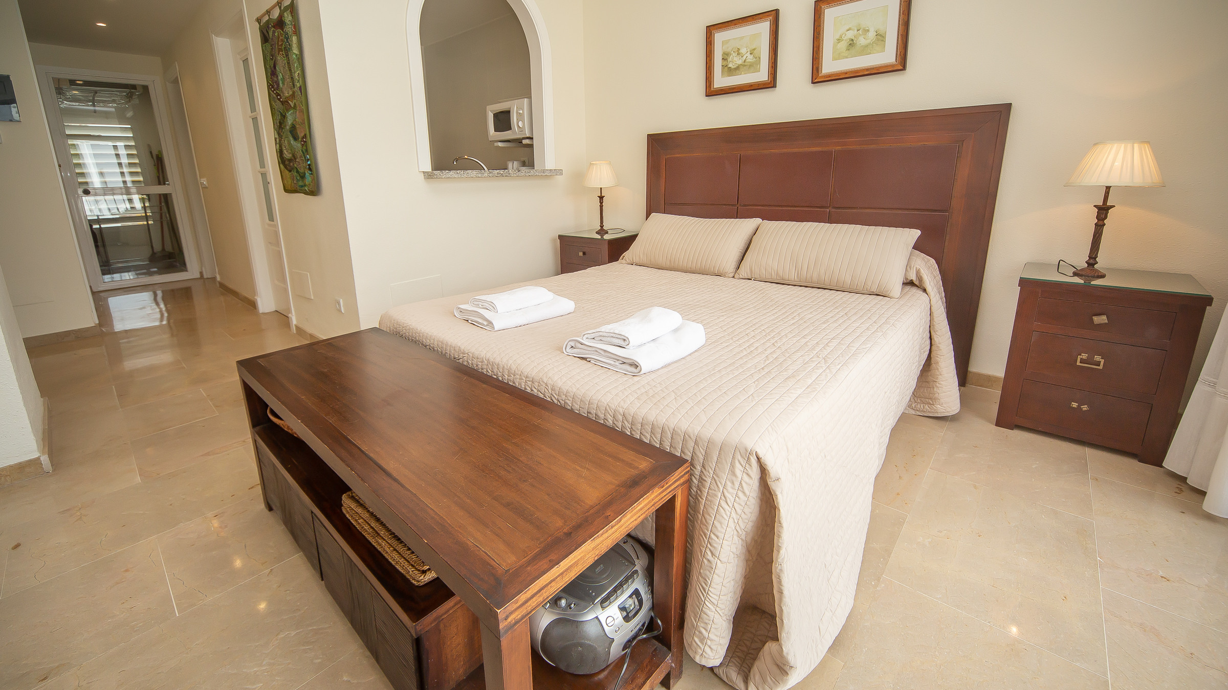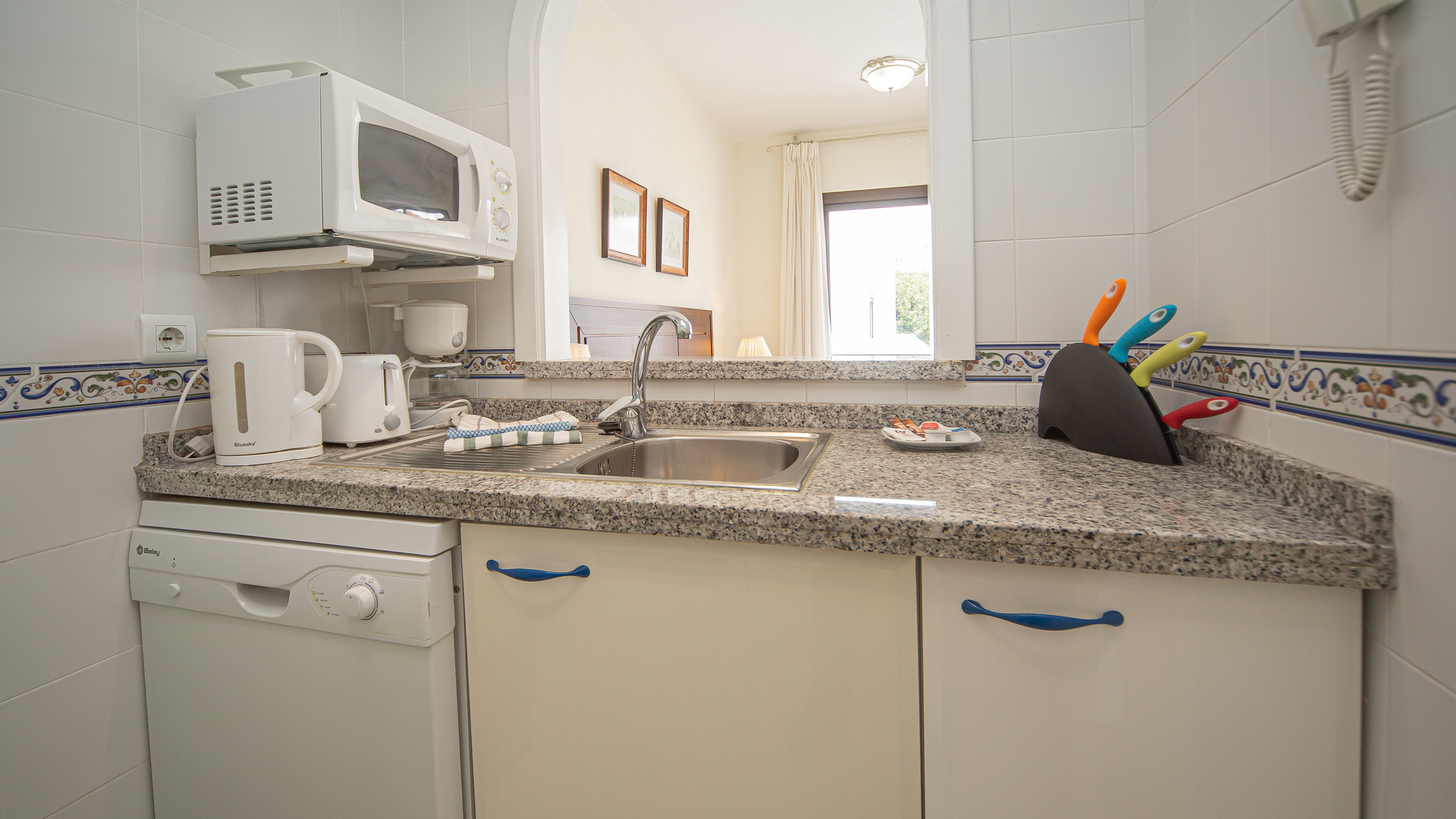 La cocina americana, está equipada con nevera, microondas, horno y lavavajillas.