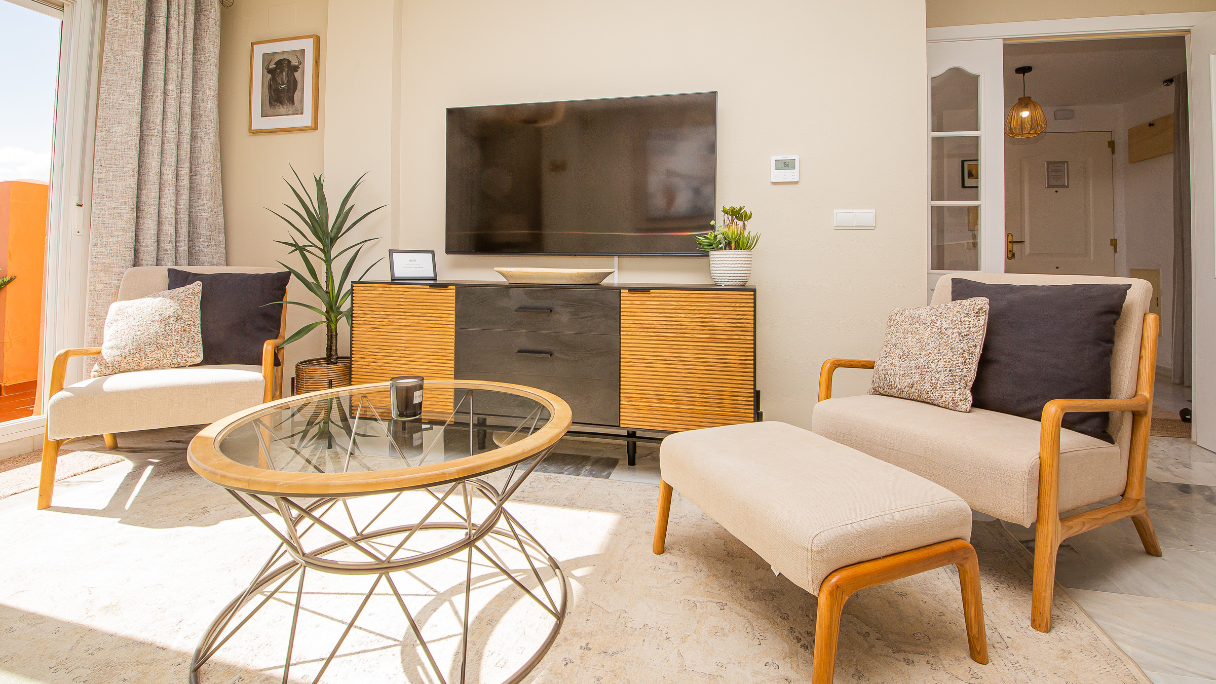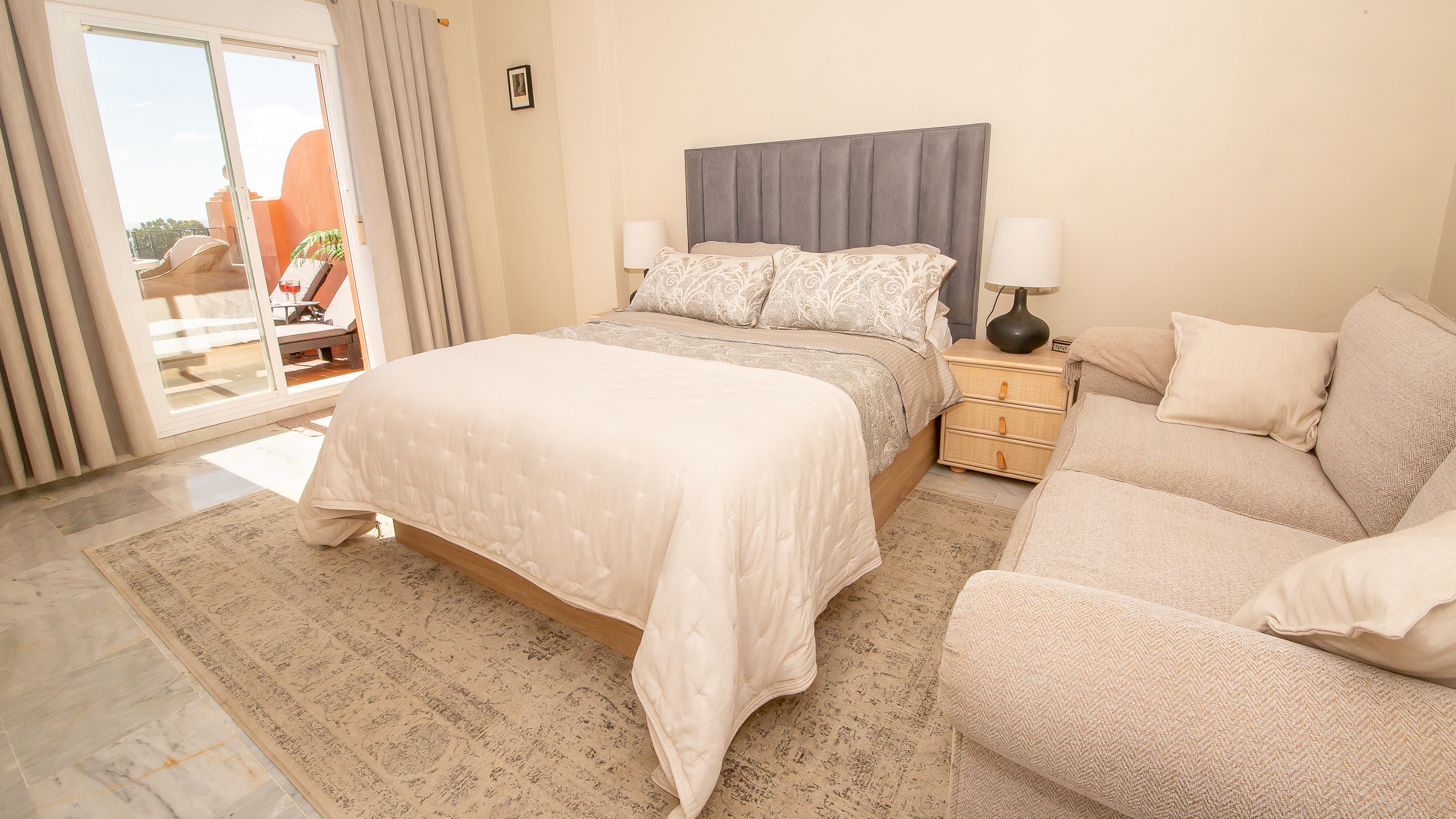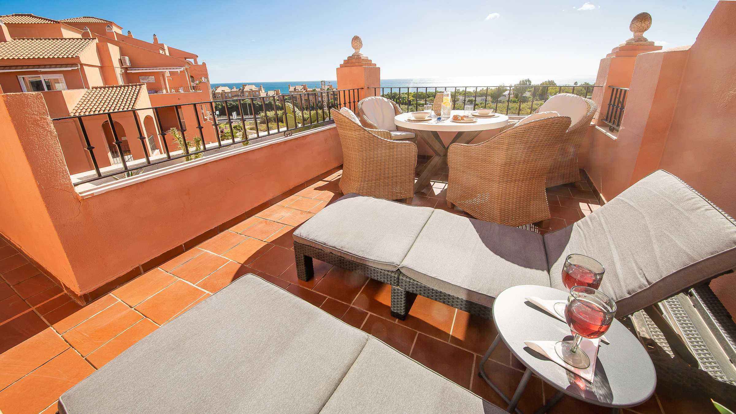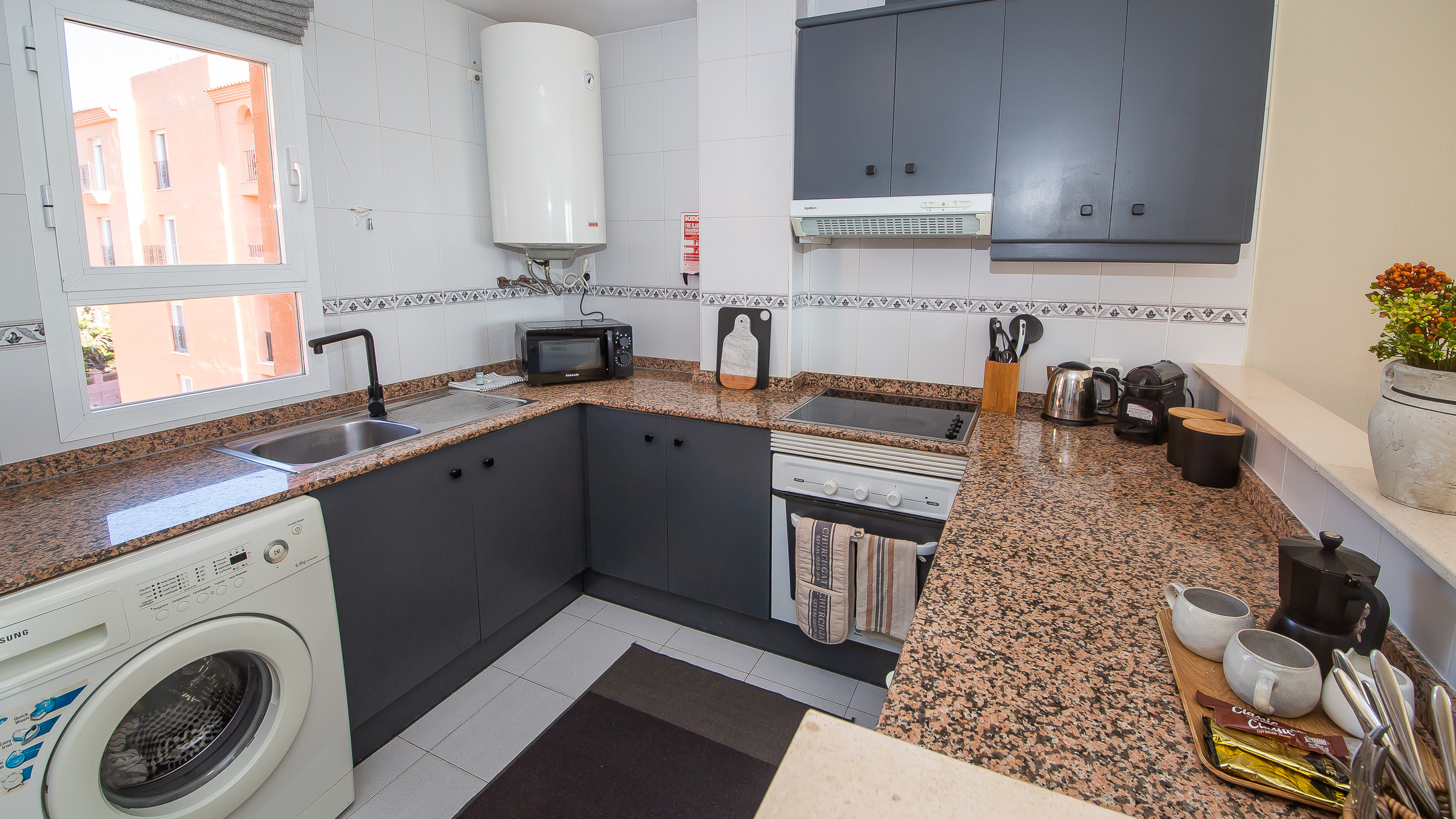 One bedroom, one bathroom penthouse apartment in Los Hidalgos Golf. This sunny apartment is fully air conditioned, has it's own WiFi connection, lounge with open plan kitchen and patio doors leading onto the main terrace. The terrace from the lounge is south west facing with lots of sun, views to the sea and the vineyard, and is furnished with a table, chairs and two sunbeds. The second terrace has views to the communal swimming pool and is furnished with a table and chairs. You can also access the front terrace from the large bedroom.