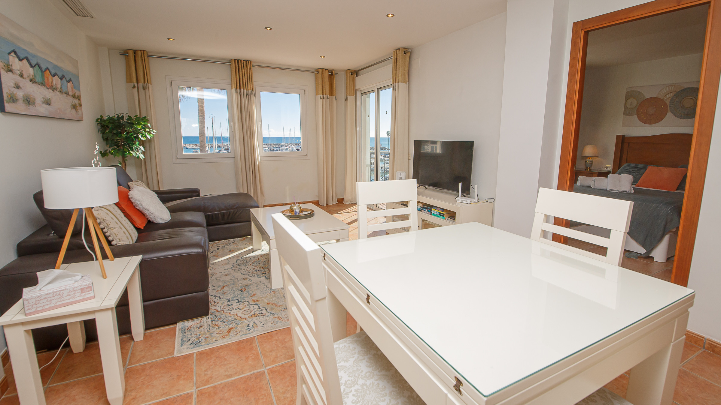 Two-bedroom, two-bathroom apartment located in the heart of Puerto de la Duquesa. The apartment has been renovated and has fantastic views of the marina. The apartment has WiFi, open plan kitchen and terrace with glass curtains that is furnished with a table and four chairs ideal for outdoor dining.