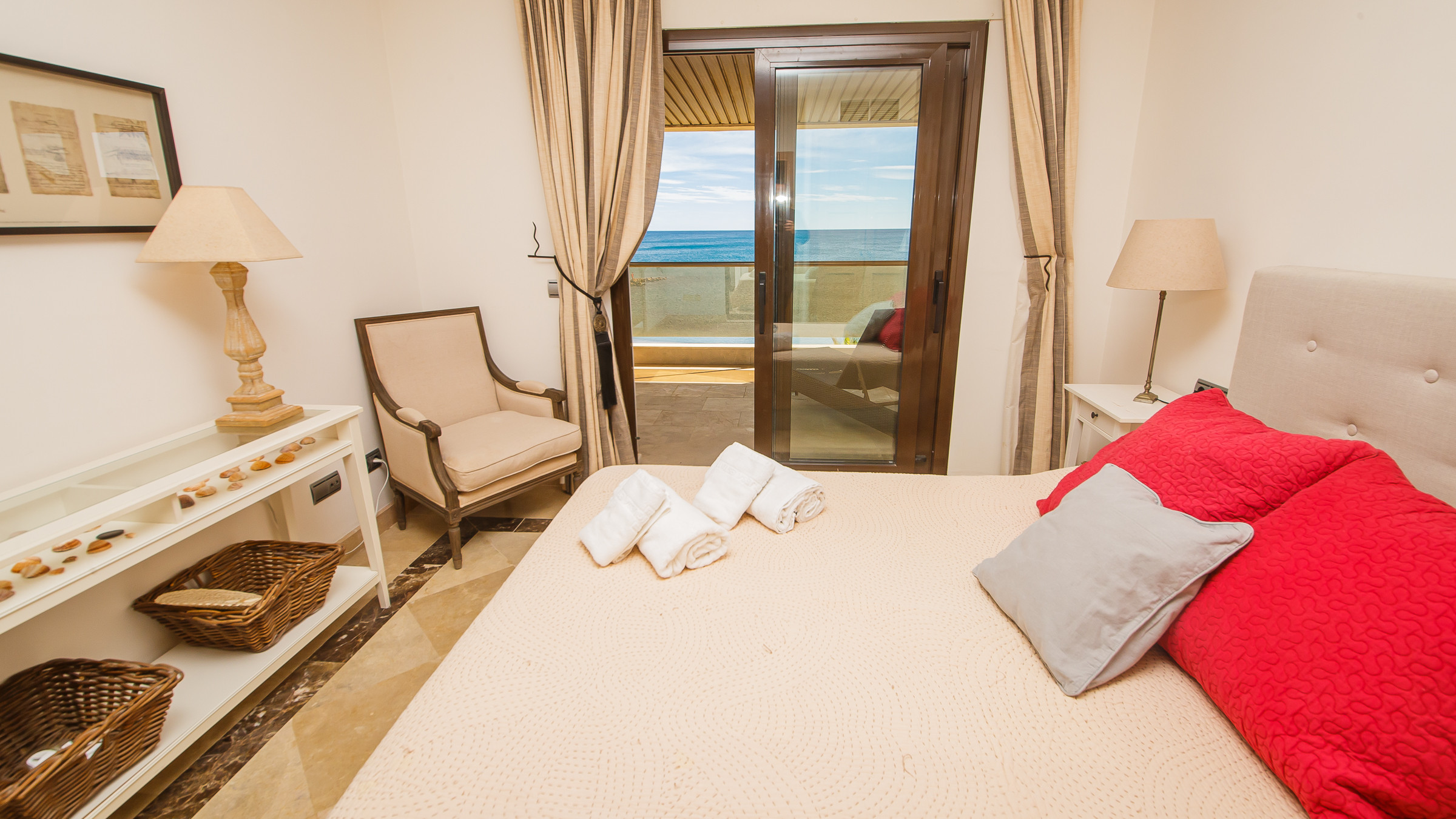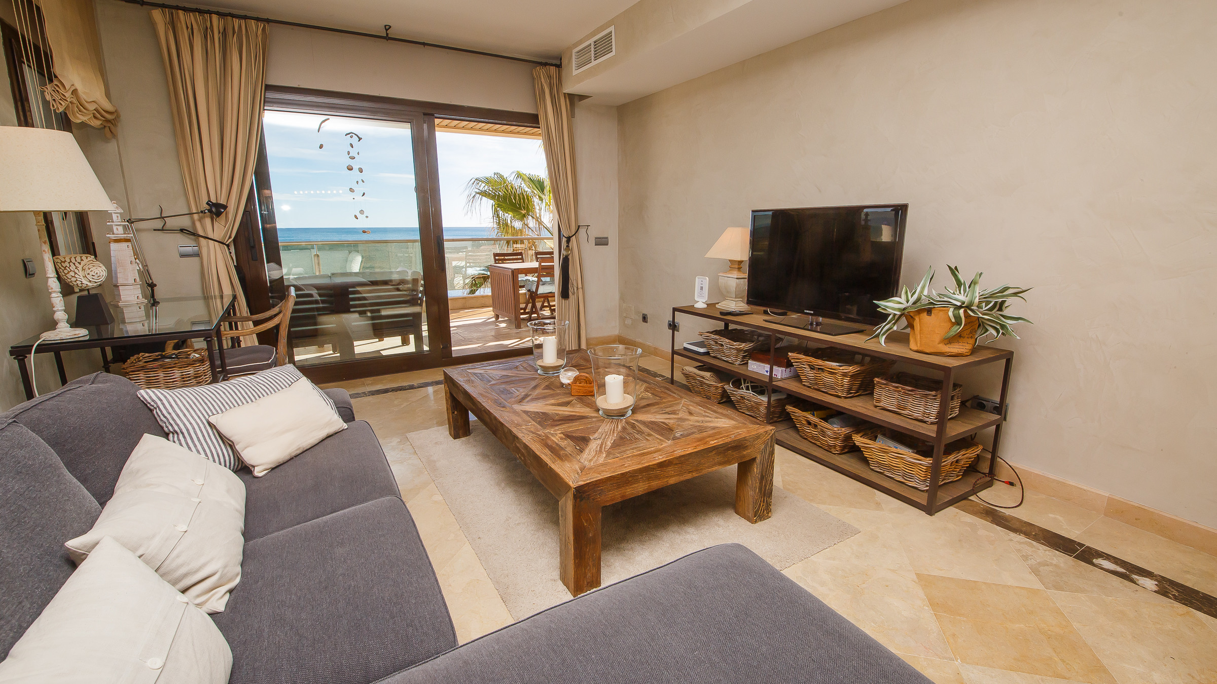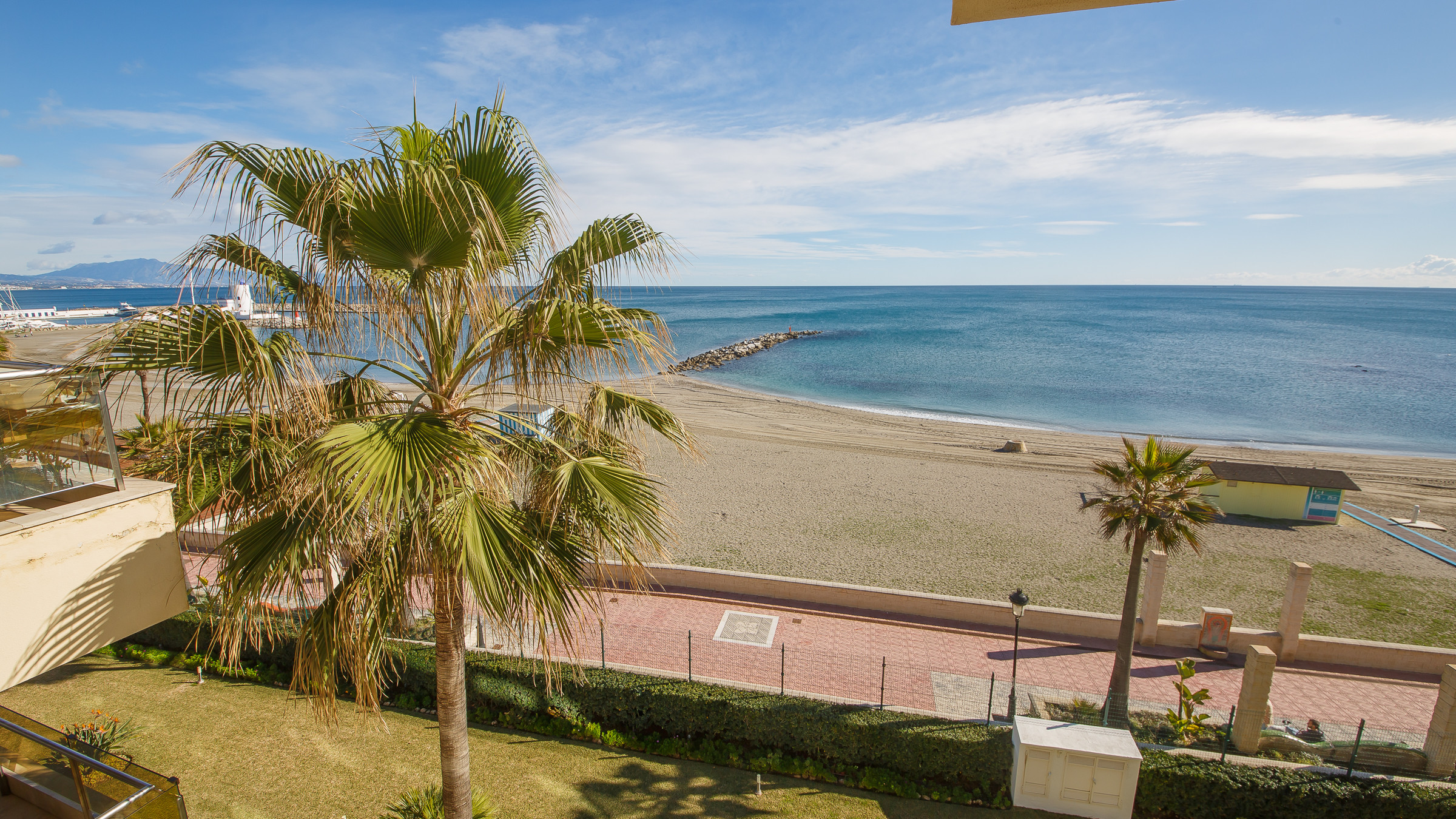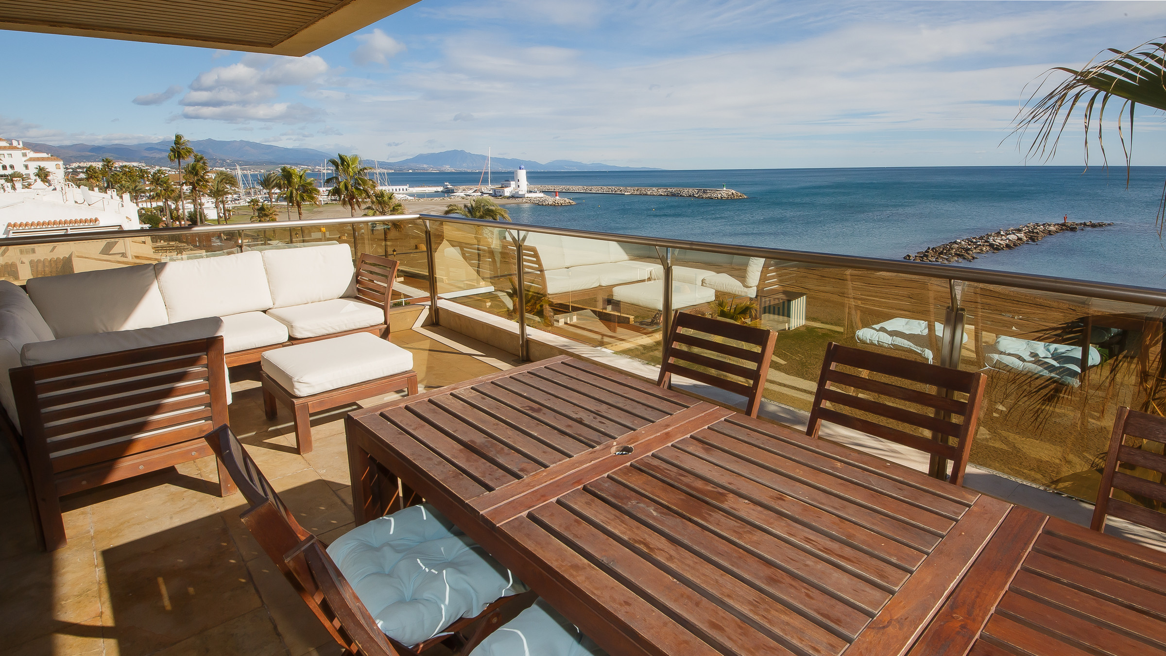 Three bedroom, two bathroom apartment in Marina del Castillo, just a short stroll along the promenade to Puerto de la Duquesa. Two terraces with incredible sea views. The main one is accessed from the living room and is furnished with an outdoor sofa set, table and six chairs. The secondary terrace has access from the main bedroom and has a sun lounger. The apartment has air conditioning throughout, its own WiFi connection and an underground parking space in the same building.