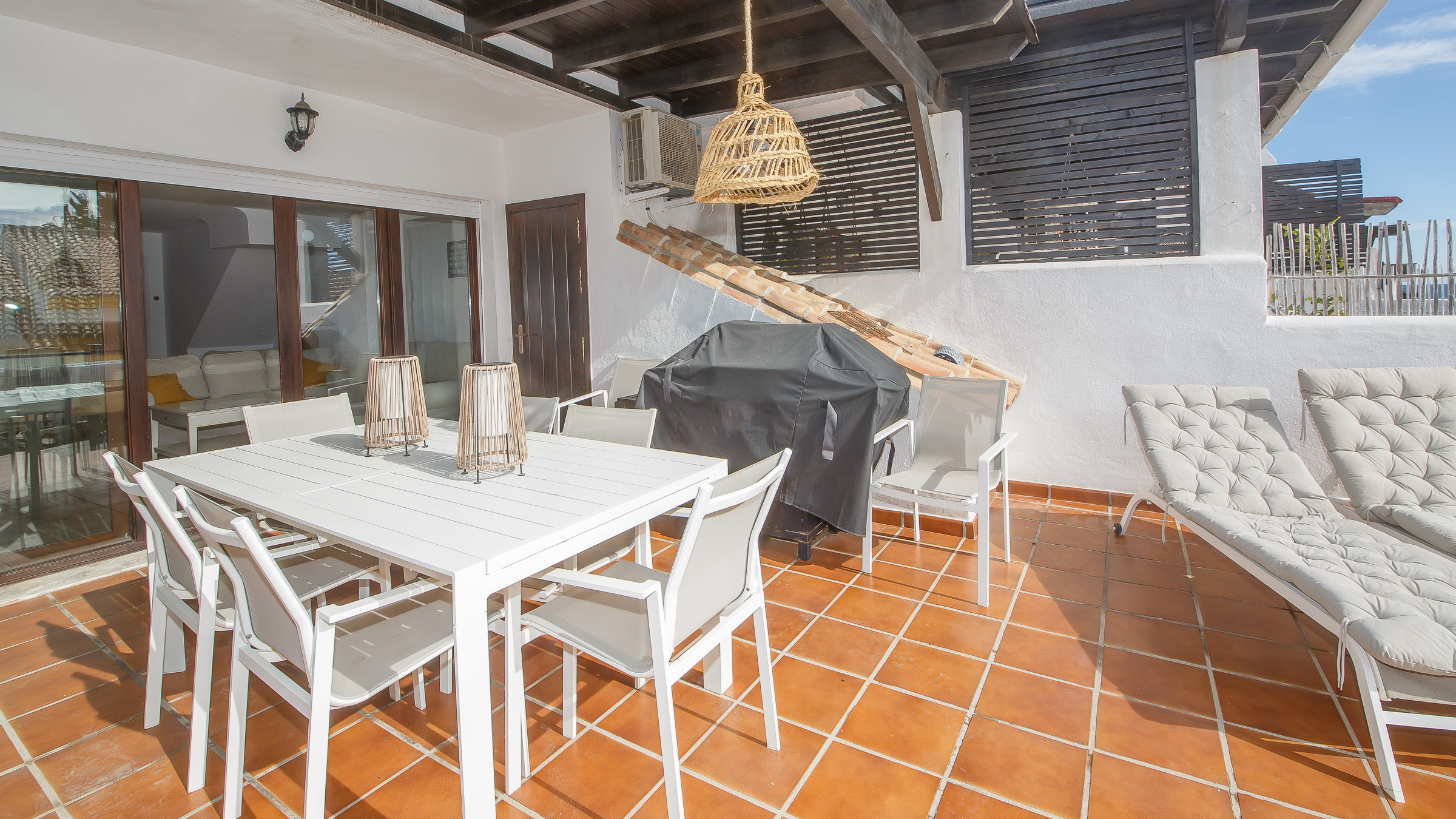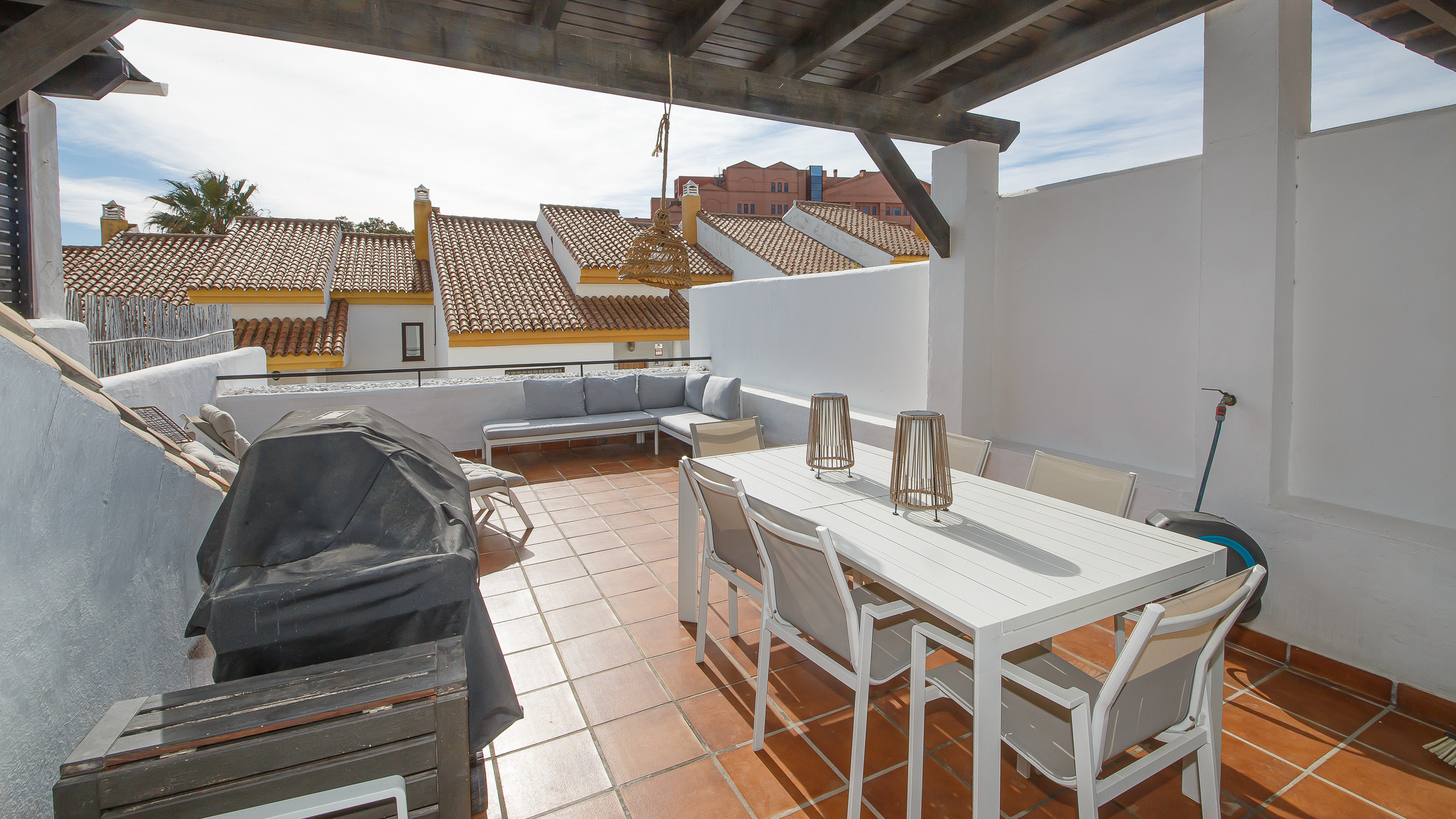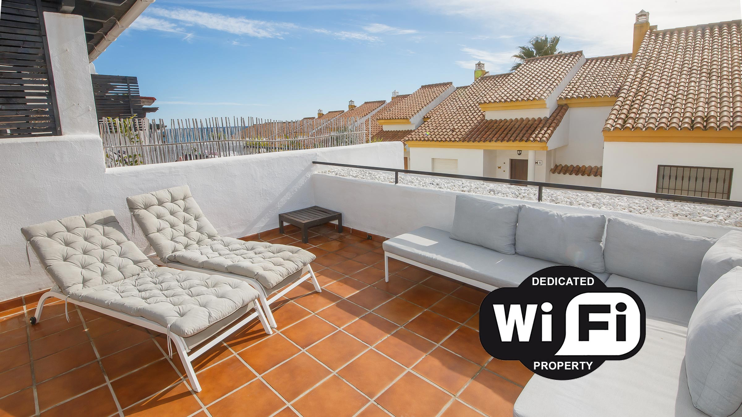 First Floor: Features an expansive living room, a kitchen, and a guest toilet. The highlights are the furnished terrace with an outdoor sofa, a dining set for six, and two sun loungers.