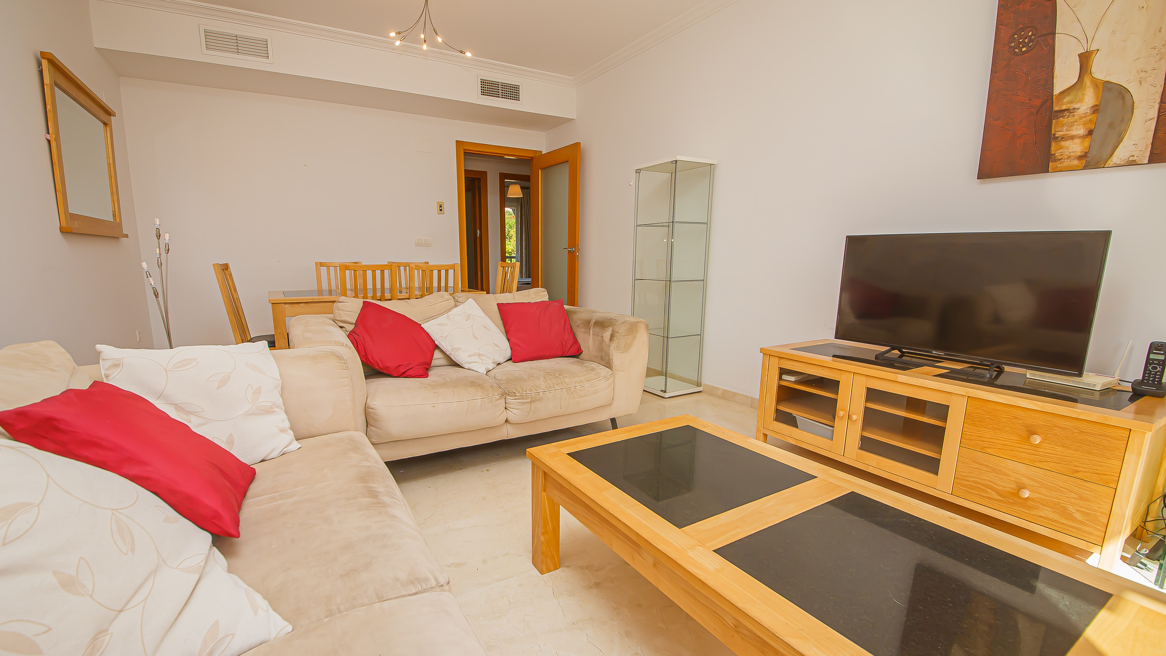 The accommodation is equipped with the following items: terrace, washing machine, central heating, air conditioning throughout the house, communal swimming pool, covered parking the same building, TV.